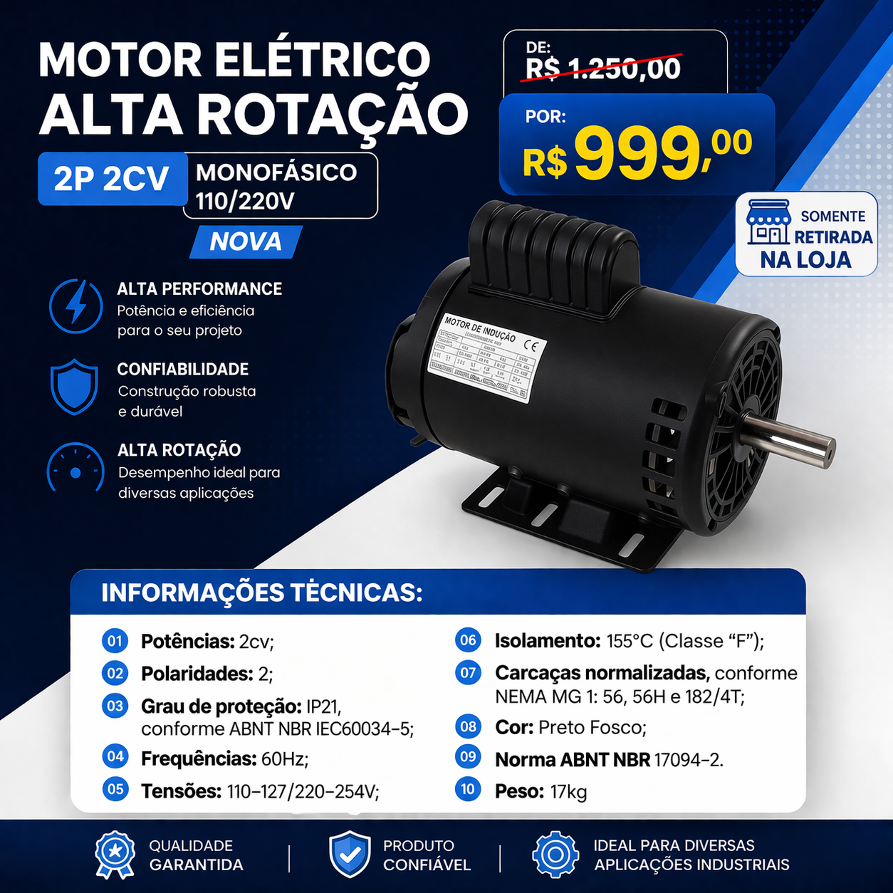 Motor Elétrico Alta Rotação 2P 2CV Monofásico 110/220V NOVA